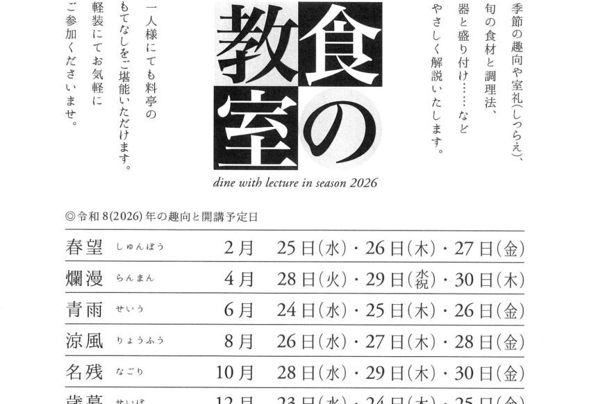 季節の趣向や室礼(しつらえ)、旬の食材と調理法、器と盛り付け……などやさしく解説いたします。 一人様にても料亭のもてなしをご堪能いただけます。軽装にてお気軽にご参加くださいませ。 ◎令和8(2026)年の趣向と開講予定...