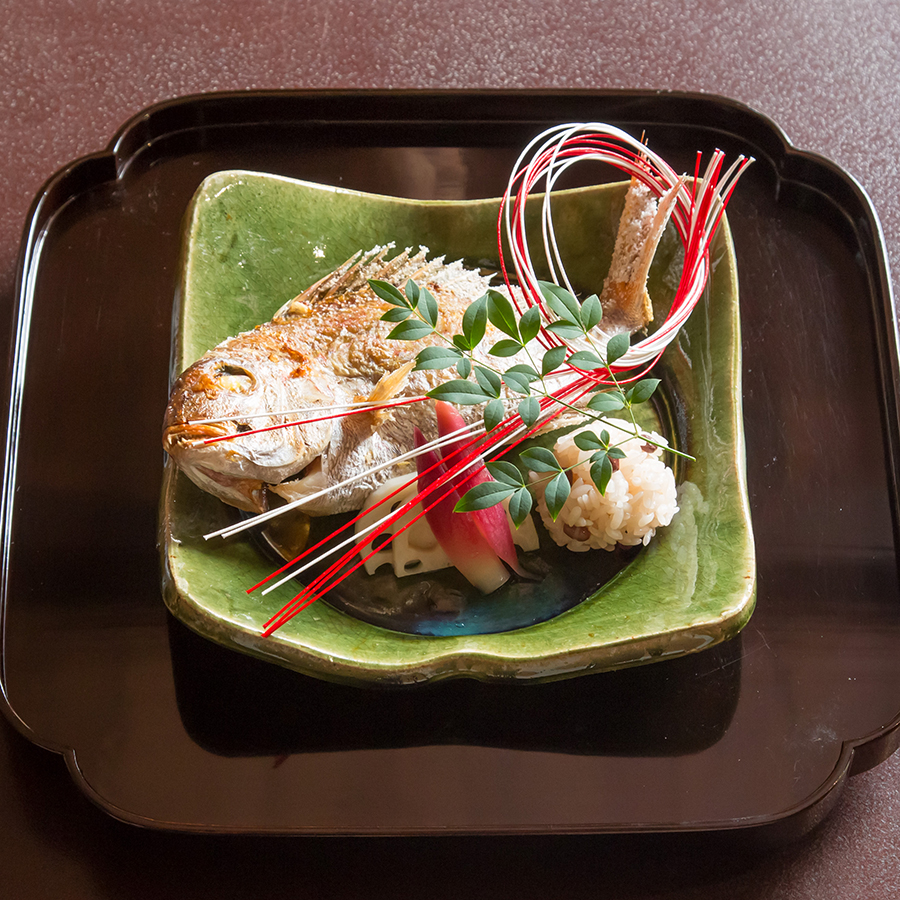 焼魚は鯛のお頭付(200g未満)に赤飯が付いてきます。